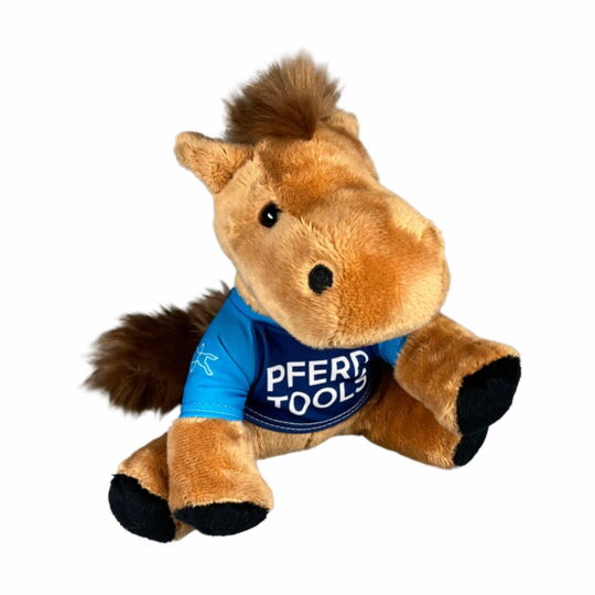 The plush horse is reddish brown with a fluffy mane and wears a T-shirt in the PFERD TOOLS style.