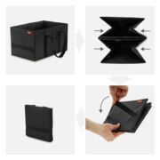 In Sekunden schnelle ist die Klappbox mit einem Griff aufgestellt und einsatzbereit, aber auch genauso schnell bei Nichtgebrauch platzsparend zusammengeklappt. Mit dem Gummiband wird der gefaltete Korb fixiert. Ideal zum Verstauen im Auto oder zuhause.